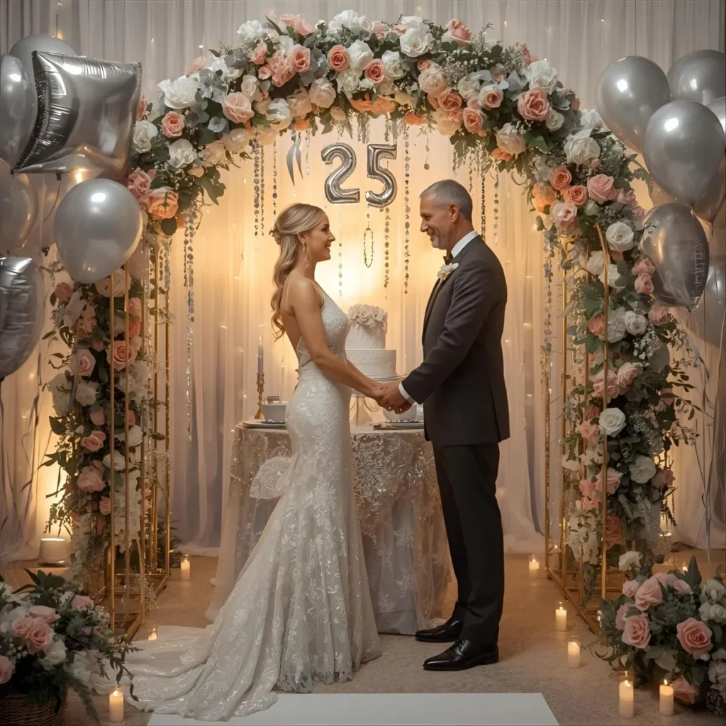 How do you celebrate a 25th wedding anniversary? Common ways include renewing vows, hosting a party, gifting silver items, or taking a trip. Personalize with 25th anniversary wishes for added sentiment.